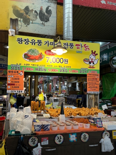 후라이드, 양념, 매운양념 중 선택 가능한 수제 닭꼬치 메뉴. 시장에서 간단히 즐기기 좋은 먹거리다.