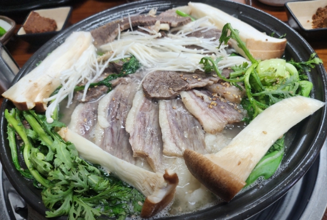 이 식당의 대표 메뉴이자 방송의 핵심 메뉴. 장작불로 우려낸 진한 국물에 소면까지 더해져 든든하게 즐길 수 있는 곰탕이다. 뜨거운 뚝배기에 제공되어 식사 내내 온기가 유지된다는 점도 특징이다.