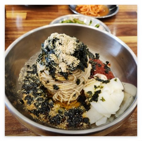직접 짠 들기름과 들깻가루, 채소를 숙성시켜 만든 특제 간장소스를 비벼 먹는 막국수. 들비막국수보다 보다 기본적인 들기름막국수 스타일에 가깝다.