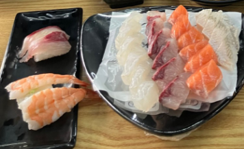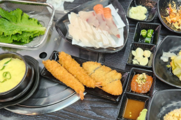 모둠회 중 또는 대방어 소 + 해물 6종 + 초밥 8p + 고등어구이 + 새우튀김 6p + 매운탕.