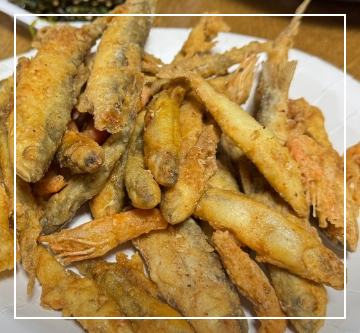 바삭하게 구운 생선을 고추장 양념으로 버무린 메뉴로, 겉은 고소하고 속은 부드러운 식감이 특징이다.