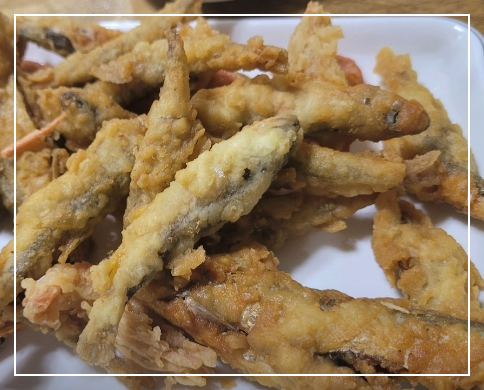바삭한 튀김과 담백한 생선살의 조합이 좋은 메뉴로, 국수와 함께 곁들여 먹기 좋다.