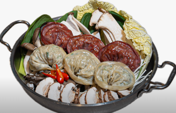 한우 사골 육수에 고기만두와 김치만두, 채소를 푸짐하게 담은 전골 메뉴 - 정초 손만둣국 (11,000원)
