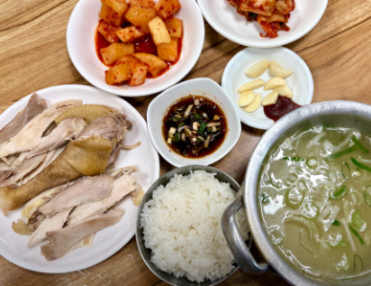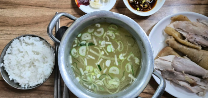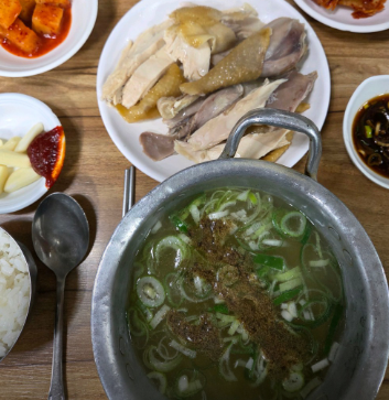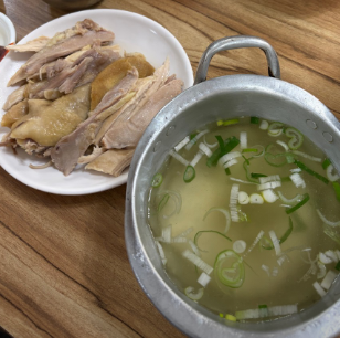 설명: 닭고기와 국물을 따로 제공하는 백반 형태의 메뉴로, 닭고기를 간장 양념에 찍어 먹으며 즐길 수 있다.