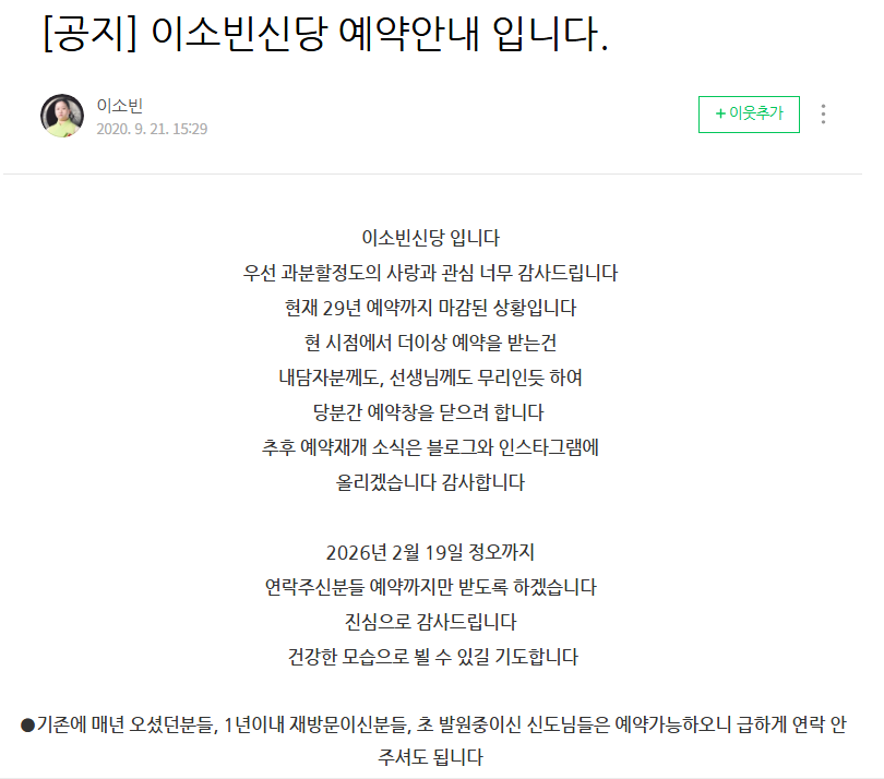 이소빈 신당 공식 안내에 따르면, 현재 2029년 예약까지 모두 마감된 상태입니다. 현 시점에서 추가 예약을 받는 것은 내담자와 상담자 모두에게 무리가 될 수 있어 당분간 예약창을 닫는다는 공지가 올라왔습니다.