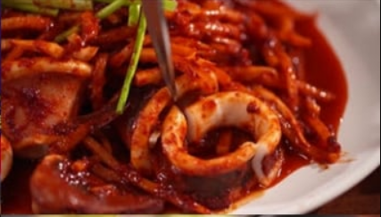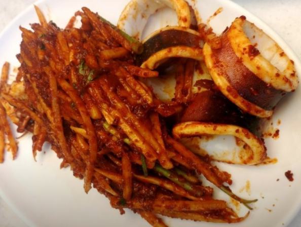→ 무채와 고춧가루를 넣어 센 불에 볶아낸 매콤한 오징어를 상추에 싸 먹는 대표 메뉴입니다.
