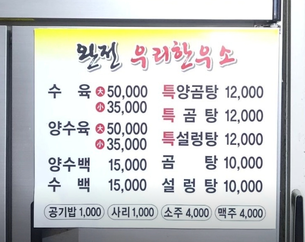 - 대표 메뉴: 양수백 15,000원 / 특 양곰탕 12,000원
