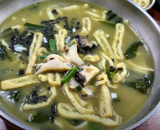 보말과 전복을 넣어 깊은 바다 풍미를 살린 제주식 칼국수. 신선한 해산물에서 우러난 국물이 특징이며, 손반죽 면발이 쫄깃한 식감을 더한다.