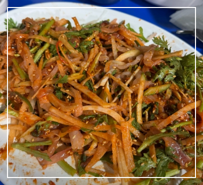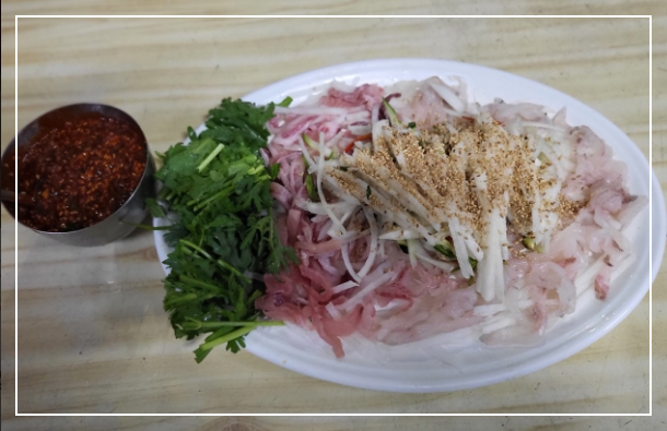 가자미와 청어 등 다양한 생선이 어우러진 메뉴로, 특제 양념과 채소를 함께 비벼 먹는 것이 특징이다. 고소하면서도 새콤달콤한 맛이 조화를 이루며, 그냥 먹거나 김에 싸 먹어도 잘 어울린다.