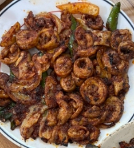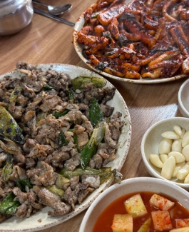 통통한 오징어를 매콤한 양념에 버무려 직화로 구워낸 경주단골식당의 대표 메뉴입니다. 불향이 강하게 살아 있으며, 매운맛은 신라면 정도로 평가되지만 쌈이나 국밥과 함께 먹으면 부담 없이 즐길 수 있습니다.