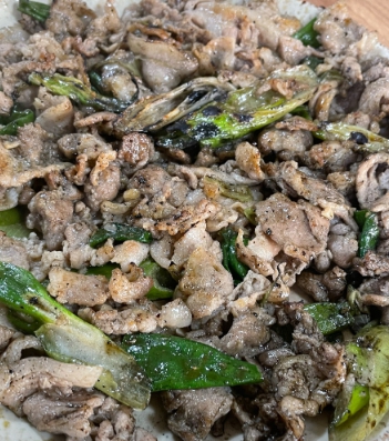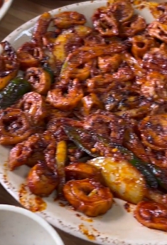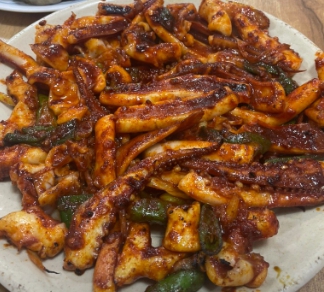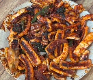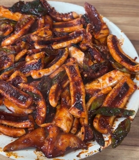 닭고기를 매콤한 양념에 재워 불판 위에서 직화로 구워낸 메뉴입니다. 오징어불고기보다 상대적으로 부드러운 식감으로 매운 음식이 부담스러운 분들에게도 선택도가 높은 편입니다.